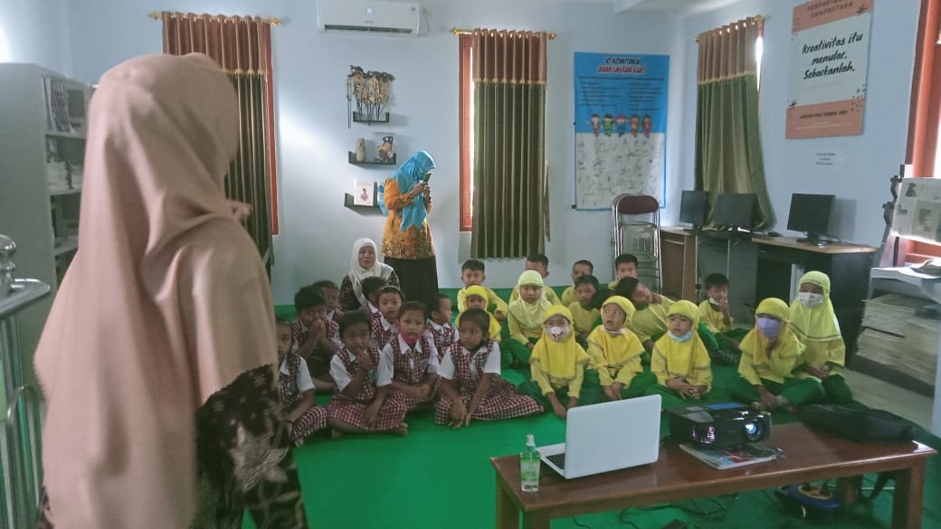 Di perpustakaan, mereka langsung dipandu menuju lantai 2 perpustakaan, dimana ruangan telah disiapkan untuk melaksanakan kegiatan Nobar (Nonton Bareng) Kartun Sejarah Nabi-Nabi. Sebelum acara nobar dimulai, Eny Suprapti, S.Pd. selaku Kepala TK Bhakti Pertiwi terlebih dahulu memberikan arahan tentang tata tertib berada di ruang perpustakaan. Ketika film mulai diputar, anak-anak nampak menyimak dengan khidmat. Setelah pemutaran film selesai, para siswa juga diajak untuk membaca buku-buku anak milik perpustakaan.