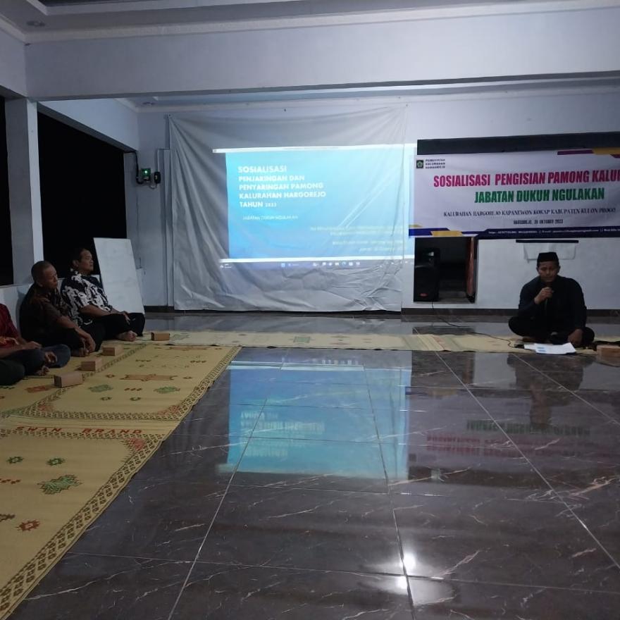 Hargorejo, Jum’at (20/10/2023) telah diselenggarakan kegiatan Sosialisasi Penjaringan dan Penyaringan Pamong Kalurahan Hargorejo untuk pengisian Dukuh Ngulakan. Kegiatan tersebut dilaksanakan di Balai Kalurahan Hargorejo dan diikuti oleh seluruh Pamong, Dukuh dan staff serta dari BPK.