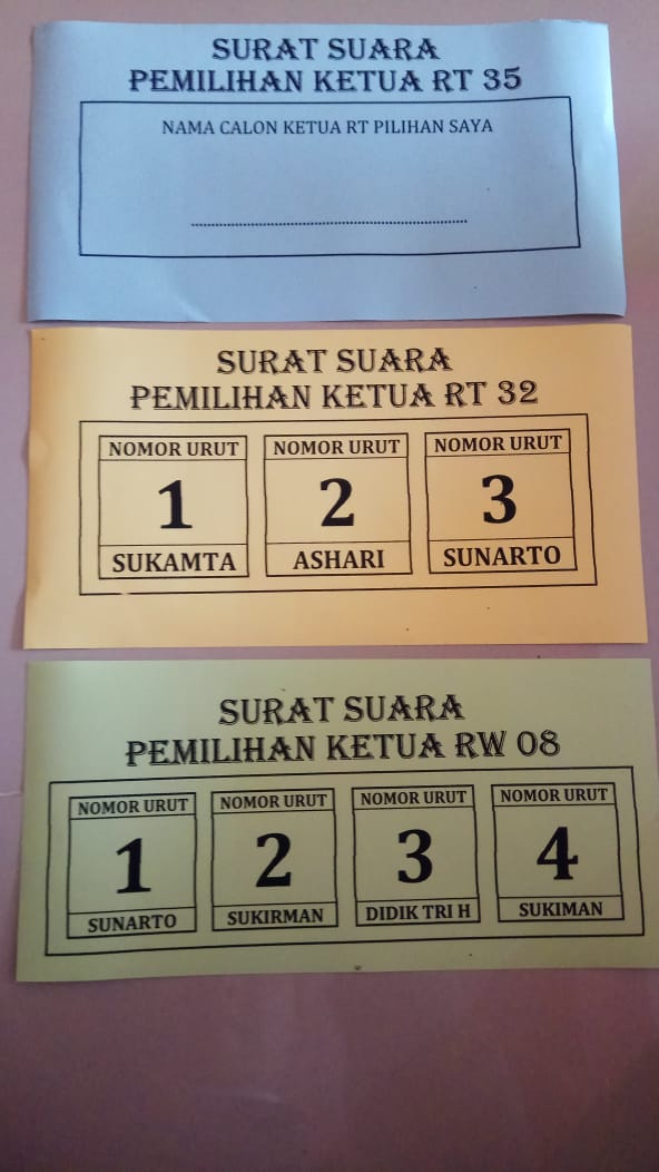 Adapun ketua RT yang dipilih adalah RT 32 dan RT 35. Sementara RW yang dilakukan pemilihan adalah RW 08. Meskipun dengan system yang agak sedikit berbeda. Pemilihan RT 35 dilaksanakan dengan cara warga yang telah memiliki hak pilih untuk menuliskan nama Ketua RT pilihannya. Sementara RT 32 dengan memilih 3 calon yang sudah ada. Diantaranya adalah Sukamta, Ashari dan Sunarto. Sementara untuk calon 4 Ketua RW 08 adalah Sunarto. Sukirman, Didik Tri Haryanto, dan Sukiman.