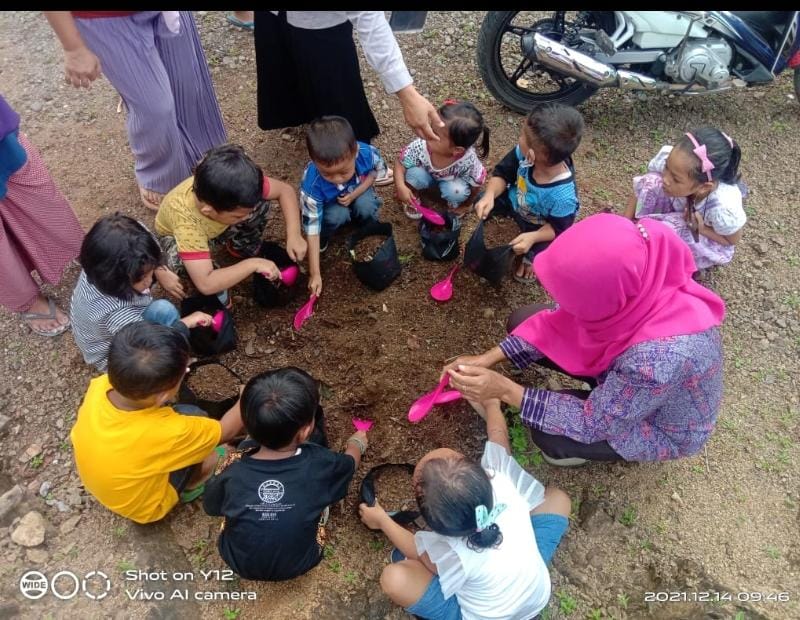 Disela-sela pengambilan tugas BDR. Selasa (14/12/2021) anak didik PAUD Harum diajak menanam jahe. Hal ini dilakukan saat penerapan tema pembelajaran tanaman bagi PAUD Harum. Dengan orang tua wali membawa swadaya pupuk organik,pendidik bekerja sama dengan KWT yang ada di padukuhan setempat untuk membantu pengadaan bibit jahe. Sementara sekam Pos PAUD menggunakan dana PAUD.