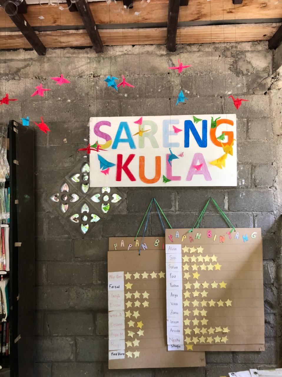 Agenda terakhir adalah membuat kerajinan. Peserta didik dibagi menjadi 3 kelompok besar, yaitu kelompok TK, SD kelas 1 dan 2 merangkai rantai dari tempat bekas air mineral, kelompok kelas 3 menyusun huruf dan menghias papan nama SARENG KULA, serta kelompok kelas 5 dan 6 membuat kerajinan origami yang berlangsung sampai dengan pukul 12.00 WIB. Semoga dengan adanya kegiatan ini dapat menumbuhkan kreativitas dan kemampuan eksplorasi peserta didik bimbingan belajar SARENG KULA.