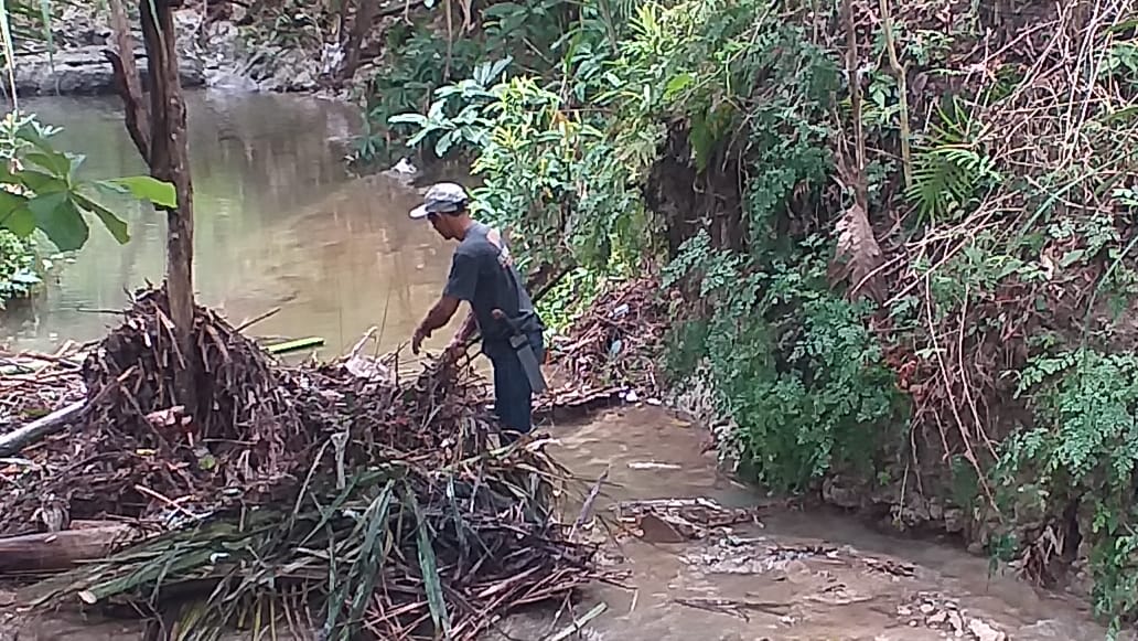 Sementara di tempat yang lain nampak seseorang yang sering dipanggil Pak Ahmadi selaku warga Rt 076 Rw 022 Padukuhan Penggung ini, sedang membersihkan dan menyingkirkan beberapa ranting pepohonan dan sampah yang terbawa arus dan tersangkut di sungai, supaya aliran air menjadi lancar dan tidak tersendat.