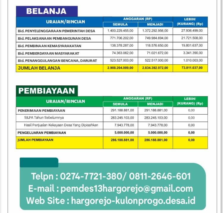 1. Pendapatan Desa 2. Belanja Desa a. Bidang Penyelenggaraan Pemerintah b. Bidang Pembangunan c. Bidang Pembinaan Kemasyarakatan d. Bidang Pemberdayaan Masyarakat e. Bidang Tak Terduga