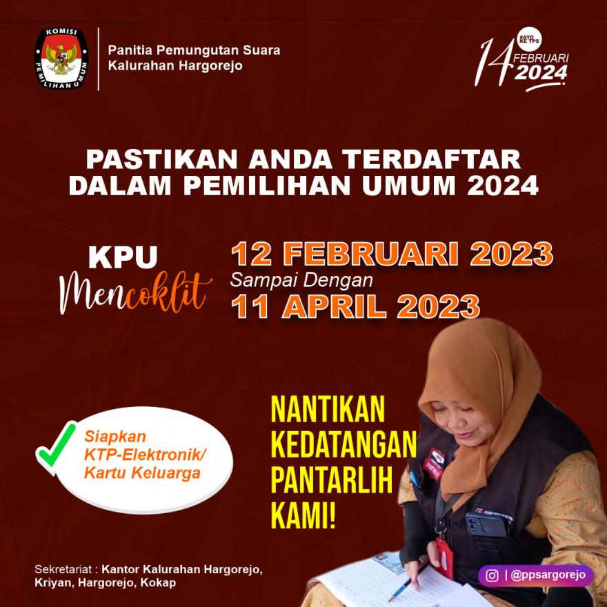 Setelah dilantik tanggal 12 Februari 2023 yang lalu, sebanyak 29 orang Pantarlih (Petugas Pemutakhiran Data Pemilih) Hargorejo mulai bertugas sesuai dengan kewilayahan TPS yang tersebar di 16 Padukuhan di Kalurahan Hargorejo.