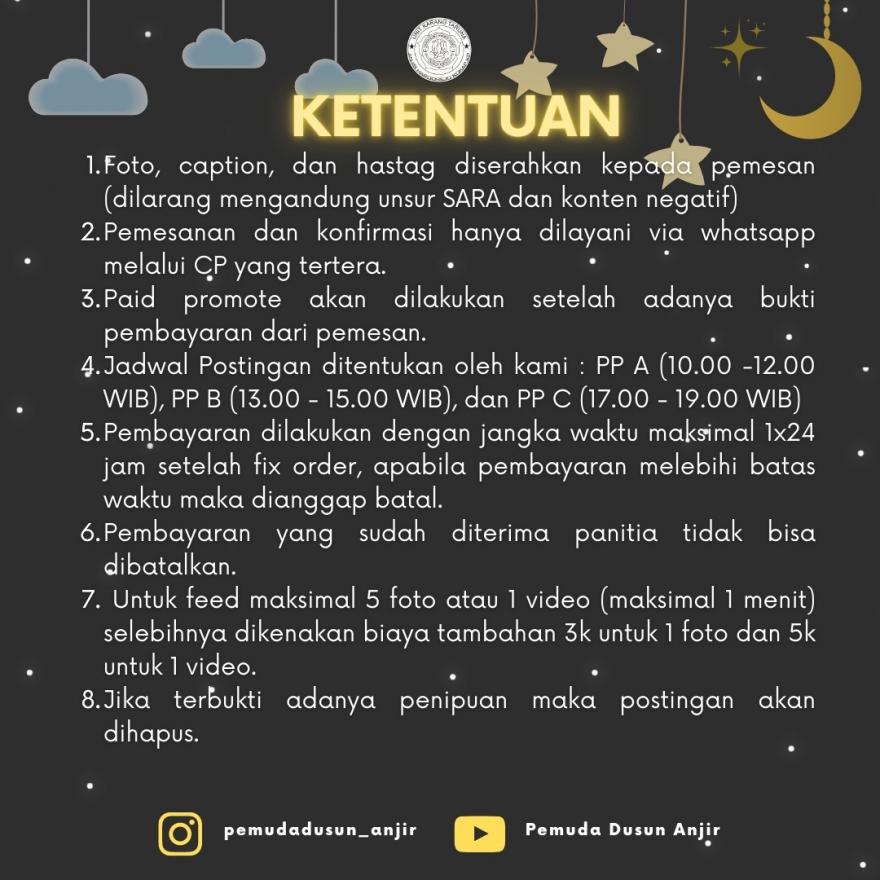 Untuk membatasi ruang lingkup jenis-jenis produk yang dapat dipromosikan, Karang Taruna Anjir menetapkan beberapa ketentuan untuk disepakati bersama. Sedangkan prosedur untuk mengikuti promosi berbayar, pemilik UMKM atau penyedia jasa hanya cukup menghubungi narahubung yang tertera pada pamflet, menyiapkan foto produk beserta kalimat pengantar untuk deskripsi produk, dan nomor kontak atau media sosial yang dapat dihubungi, kemudian menyelesaikan biaya administrasi.