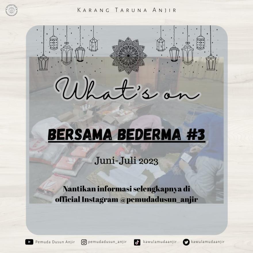 Pada Ramadhan 1444 H/2023 M, Karang Taruna Anjir kembali memulai rangkaian kegiatan Bersama Bederma Edisi ke 3. Seperti yang telah diketahui, bahwa Bersama Bederma merupakan kegiatan sosial masyarakat yang diselenggarakan oleh Karang Taruna Anjir sejak 2021. Kegiatan sosial masyarakat yang pernah dilakukan dalam Bersama Bederma, di antaranya :