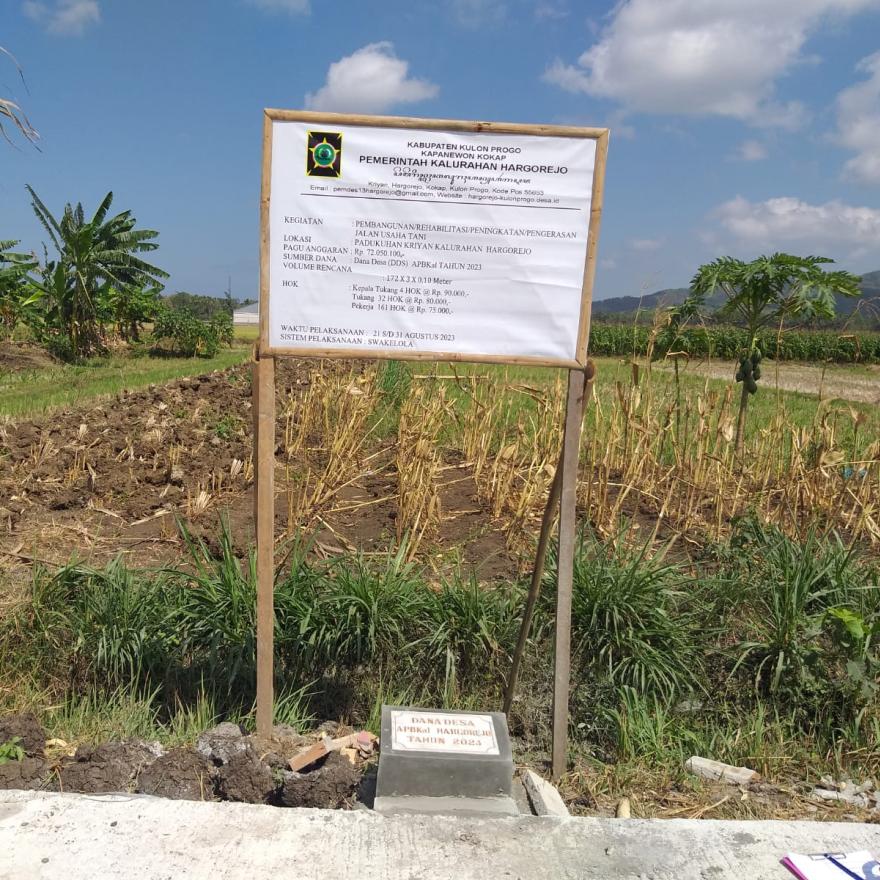 Jalan usaha tani ini merupakan salah satu kegiatan ketahanan pangan di Kalurahan Hargorejo yang didanai dari Dana Desa APBKal tahun 2023. Tujuan pembangunan jalan ini adalah memperlancar akses petani dari dan menuju sawah. Rencananya, pembangunan jalan akan dilakukan dengan dimensi 172 m x 3 m x 0,10 meter.