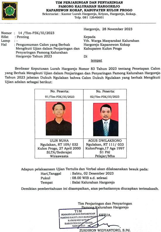 Mendasar pada Keputusan Lurah Hargorejo Nomer 83 tahun 2023, Tim Penjaringan dan Penyaringan Pamong Kalurahan Hargorejo Kapanewon Kokap mengumumkan Calon yang berhak mengikuti ujian verbal dan tertulis dalam Penjaringan dan Penyaringan Pamong Kalurahan Hargorejo tahun 2023 Formasi Dukuh Ngulakan yang akan dilaksanakan pada hari Sabtu tanggal 2 Desember 2023.