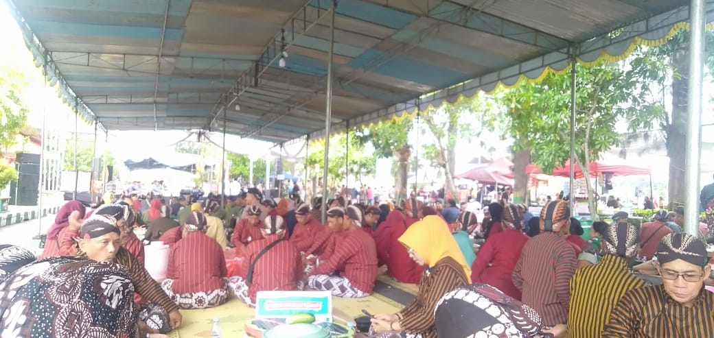 Acara selanjutnya adalah pembacaan doa syukur, kemudian rombongan Nyadran Agung dari berbagai Kalurahan mulai nampak membuka tenong yang berisi tumpeng dan ubo rampe yang semenjak tadi telah dipersiapkan untuk disantap secara bersama-sama. Acara berjalan dengan cukup khidmat, diakhiri dengan perebutan gunungan hasil bumi oleh warga masyarakat yang sedari pagi telah berdatangan memenuhi Alun-alun Wates. (Yuli S)