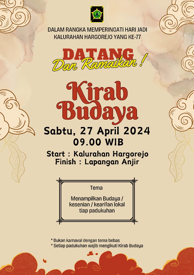 Selain pada lomba dakon dan jemparingan, Pemkal Hargorejo juga turut mengundang partisipasi seluruh warga masyarakat Hargorejo untuk meramaikan puncak peringatan Hari Jadi Hargorejo, yang rencananya akan dimeriahkan dengan kirab budaya. Kirab budaya akan dilaksanakan pada Sabtu (27/04/2024). Start kirab dimulai dari Balai Kalurahan Hargorejo dan berakhir di Lapangan Anjir. Peserta kirab dari 16 padukuhan yang ada di Hargorejo diminta untuk menampilkan potensi budaya, kesenian dan kearifan lokal dari masing-masing padukuhan. Selain peserta kirab, warga masyarakat lainnya juga diharapkan bisa meramaikan rangkaian acara tersebut sebagai bentuk rasa cinta terhadap Kalurahan Hargorejo.