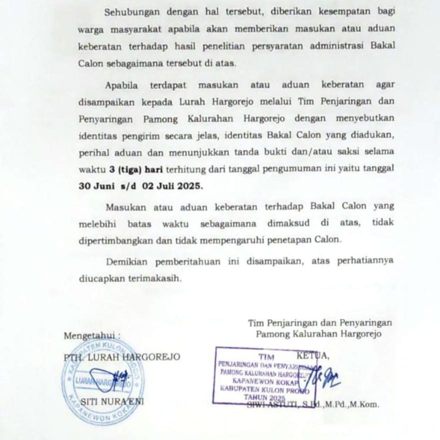 Tim Penjaringan dan Penyaringan Pamong Kalurahan (Tim P3K) menyatakan bahwa nama-nama tersebut telah melalui proses verifikasi berkas secara cermat. Namun, masyarakat tetap diberi kesempatan untuk memberikan masukan atau menyampaikan keberatan terhadap kedua calon. Aduan atau keberatan dapat disampaikan kepada Lurah Hargorejo melalui Tim P3K mulai tanggal 30 Juni hingga 2 Juli 2025.